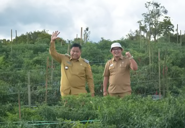 DAIRI – Bupati Dairi Eddy Keleng Ate Berutu meninjau lahan cabai yang ada di Kawasan Pertanian Terpadu (KPT) Desa Parbuluan V, Kecamatan Parbuluan, Selasa( 8/8/2023).