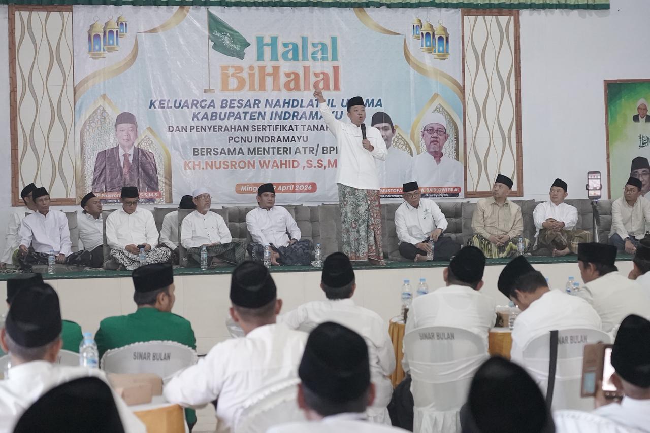 Indramayu, Tapanuli – Menteri Agraria dan Tata Ruang/Kepala Badan Pertanahan Nasional (ATR/BPN), Nusron Wahid, mengajak Nahdlatul Ulama (NU) ikut berperan menyebarkan manfaat nyata bagi masyarakat. Pesan itu ia sampaikan langsung kepada anggota yang hadir dalam Halalbihalal dan Penyerahan Sertipikat Tanah Wakaf Pengurus Cabang Nahdlatul Ulama (PCNU) Indramayu, Minggu (19/04/2026).