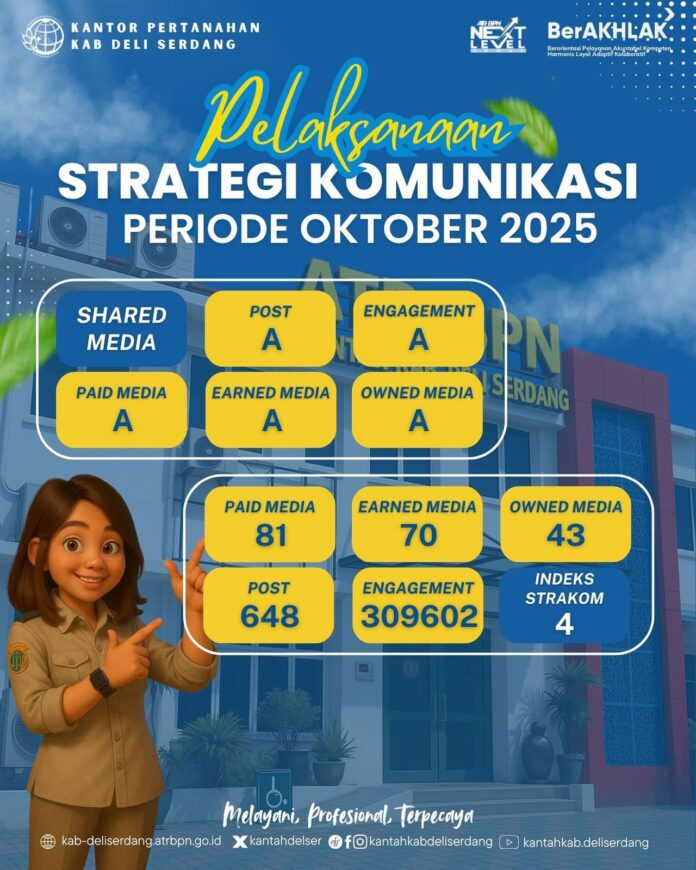 Deli Serdang, Tapanuli – Kantor Pertanahan Kabupaten Deli Serdang meraih nilai Indeks Strategi Komunikasi sebesar 4 pada periode Oktober 2025. Pencapaian ini menunjukkan bahwa pelaksanaan komunikasi publik di lingkungan kantor sudah berjalan dengan konsisten dan terarah.