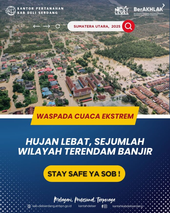 Deli Serdang, Tapanuli — Kepala Kantor Pertanahan Kabupaten Deli Serdang, Mahyu Danil, S.S.T., M.H., menyampaikan rasa belasungkawa mendalam atas musibah yang menimpa saudara-saudara kita di Aceh, Sumatera Utara, dan Sumatera Barat — termasuk rekan-rekan SobATRBPN yang berada di wilayah Kabupaten Deli Serdang.