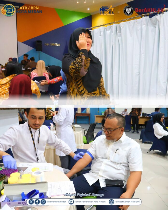 Medan, Tapanuli – Kantor Pertanahan Kota Medan melaksanakan kegiatan pemeriksaan kesehatan atau medical check up bagi seluruh pegawai sebagai bentuk kepedulian terhadap kesehatan dan kesejahteraan aparatur. Kegiatan ini bertujuan untuk memastikan kondisi kesehatan pegawai tetap terjaga sehingga dapat menunjang kinerja dalam memberikan pelayanan kepada masyarakat.