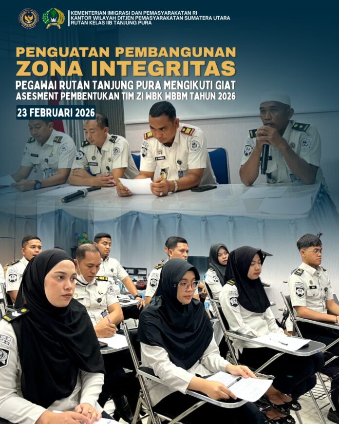 Tanjung Pura, Tapanuli – Rumah Tahanan Negara (Rutan) Kelas IIB Tanjung Pura melaksanakan kegiatan asesmen pembentukan Tim Zona Integritas (ZI) menuju Wilayah Bebas dari Korupsi (WBK) dan Wilayah Birokrasi Bersih dan Melayani (WBBM) Tahun 2026. Kegiatan tersebut digelar di Aula Rutan dan diikuti seluruh pegawai, Senin (23/02).