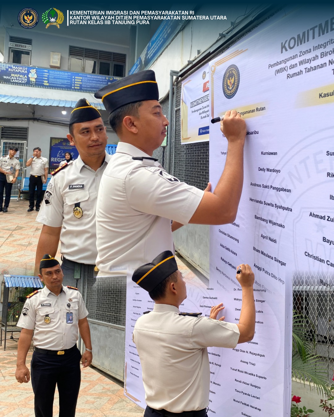Kegiatan tersebut dipimpin langsung Kepala Rutan Tanjung Pura Fransisco Pandia dan diikuti seluruh pejabat struktural serta pegawai. Penandatanganan ini menegaskan komitmen jajaran Rutan Tanjung Pura dalam mendukung reformasi birokrasi serta peningkatan kualitas pelayanan publik yang bersih, transparan, dan akuntabel.