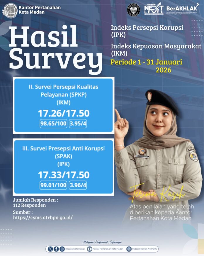 Medan, Tapanuli – Hasil Survei Kepuasan Masyarakat (SKM) terhadap pelayanan Kantor Pertanahan Kota Medan menunjukkan capaian membanggakan dengan predikat A atau kategori sangat baik. Predikat ini menjadi indikator bahwa kualitas layanan pertanahan yang diberikan telah memenuhi bahkan melampaui ekspektasi masyarakat. Penilaian tersebut diperoleh dari survei yang dilakukan secara berkala sebagai bagian dari evaluasi peningkatan mutu pelayanan publik.